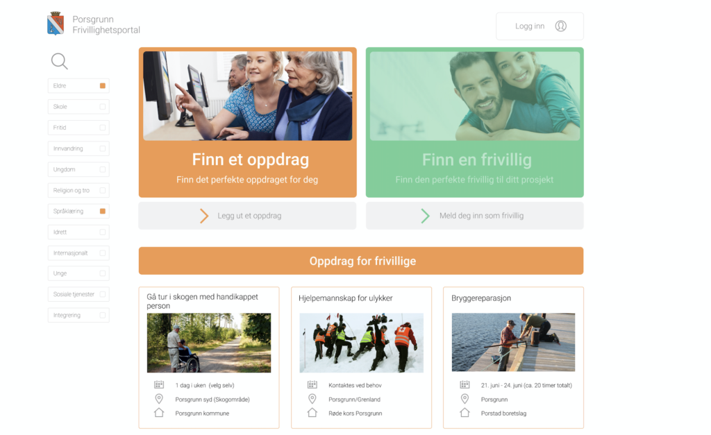 Porsgrunn kommune ønsket å en nettbasert løsning for formidling av frivillighet. Det skulle være mulig å legge ut oppdrag på en nettside slik at frivillig kunne se en liste over hvilke oppdrag som var ønsket utført. Budsjettet var stramt og de ønsket noen som kunne tenke nytt og samtidig kunne lage en kostnadseffektiv løsning.